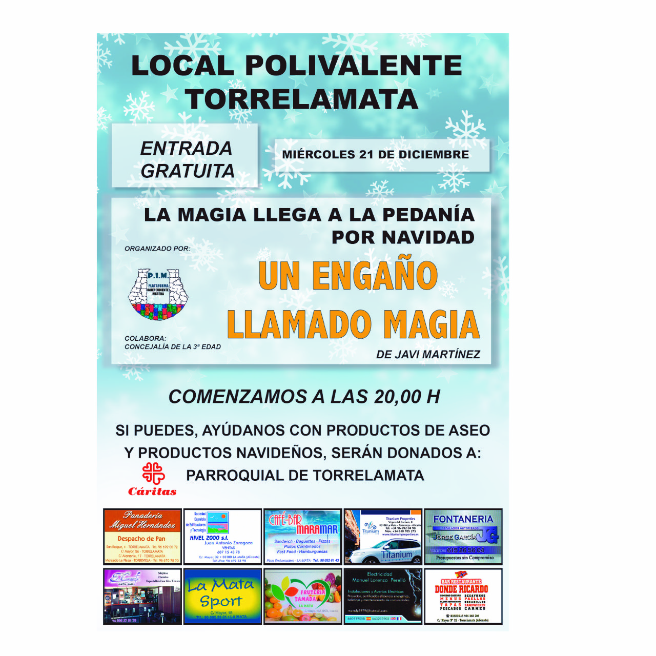 Esta se realizara en el LOCAL POLIVALENTE de TORRELAMATA el próximo MIÉRCOLES 21 de Diciembre, comenzara a las 20:00 H, tiene una una duración de una hora y media, la ENTRADA es GRATUITA y pedimos la los colaboración de NAV colaboración Ñ y de ASEO PERSONAL que serán entregados a CARITAS DE TORRELAMATA.
