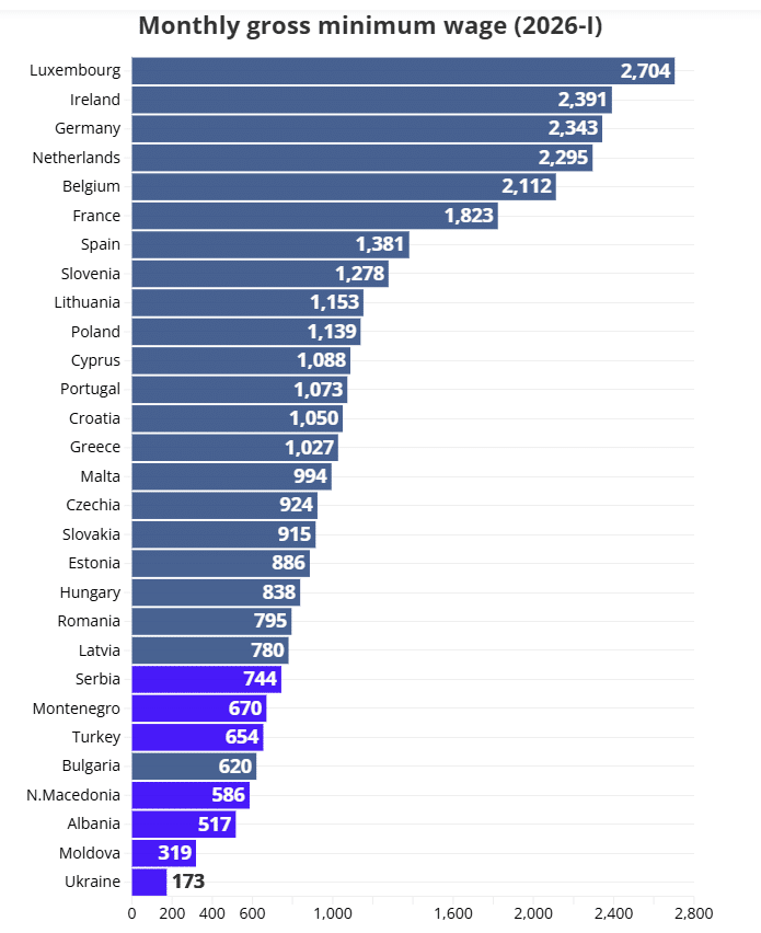 Per januar 2026, månedlig brutto minstelønn blant EUs medlemsland varierer fra bare €620 i Bulgaria til €2 704 i LuxembourgNår EUs kandidatland inkluderes, øker gapet ytterligere, med Ukraina fremstår som en klar outlier på €173, Etterfulgt av Moldova at €319.