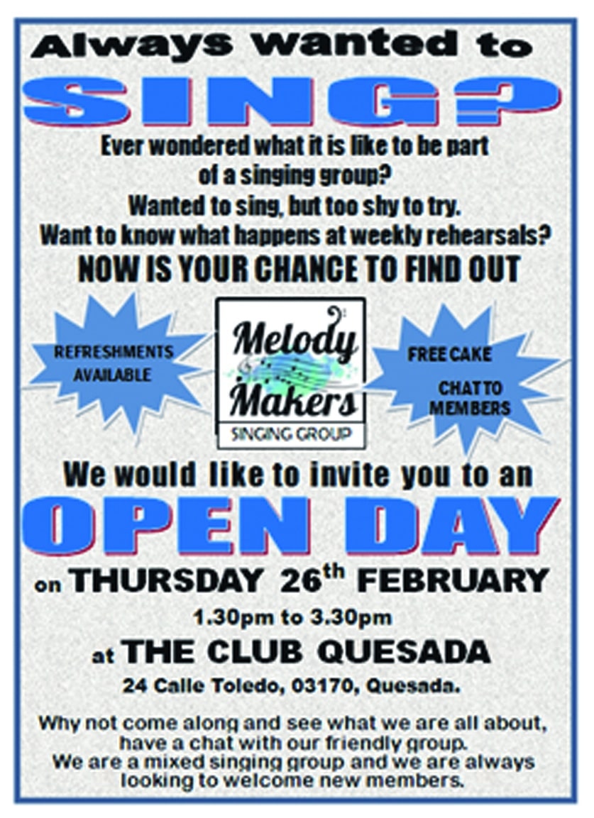 Melody Makers Singing Group Quesada holder ÅPEN DAG for nye medlemmer TORSDAG 26. FEBRUAR, kl. 1.30 til 3.30 på The Club, Calle Toledo 24, Quesada, 03170.