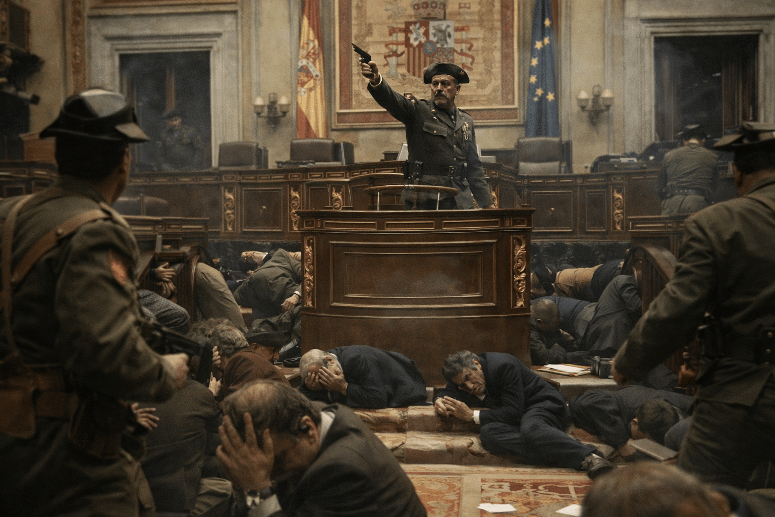 Under et direktesendt parlamentsmøte for å stemme over en ny statsminister, stormet oberstløytnant Antonio Tejero inn i Kongressen med bevæpnede offiserer fra den sivile garde, avfyrte skudd i luften og holdt parlamentsmedlemmer som gisler. Samtidig forsøkte deler av militæret å ta kontroll i andre deler av landet, særlig i Valencia, hvor stridsvogner dukket opp i gatene.